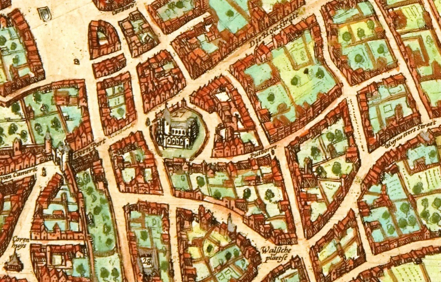 illustration : le quartier de l'Église extrait d'une carte réalisée en 1649 par Johannes Blaeu (wikipedia)