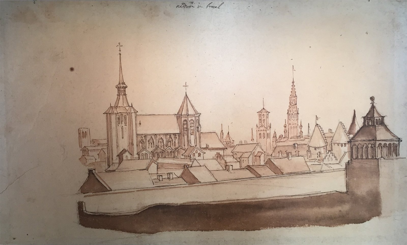 Illustration : L’Église de la Chapelle, l’Église Saint-Nicolas, l'Hôtel de Ville et la Steenpoort. Plume à l'encre brune, lavis brun sur esquisse à la pierre noire, sur papier par Remigio Cantagallina (1583-1636) (Musées Royaux des Beaux-Arts)