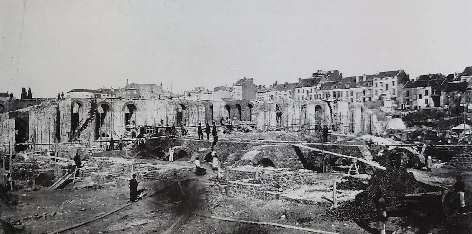 Illustration : chantier du Palais de Justice avant mars 1867 au nord de la Marolle par Edmond Fierlants (Wikimedia)