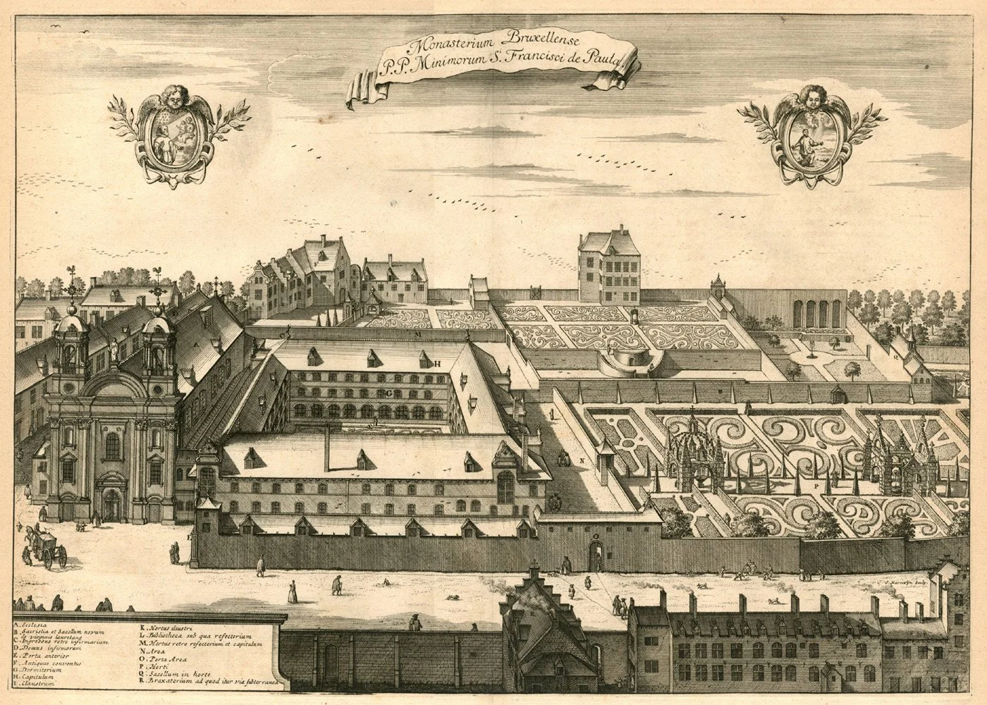 illustration : gravure par Anthonius Sanderus (1727). En 1616, Marie-Chrétienne d’Egmont, princesse de Mansfeld, duchesse douairière de Bournonville, cède la majeure partie de la propriété de Vésale aux Minimes. À l'arrière-plan, en haut à gauche, la maison de Vésale ou l'ancien couvent. Au second plan, à droite, la chapelle et l'ermitage Notre-Dame de Lorette. Le couvent était situé à l'emplacement actuel de l'Athénée Robert Catteau et de la rue des Minimes. (Wikimedia)