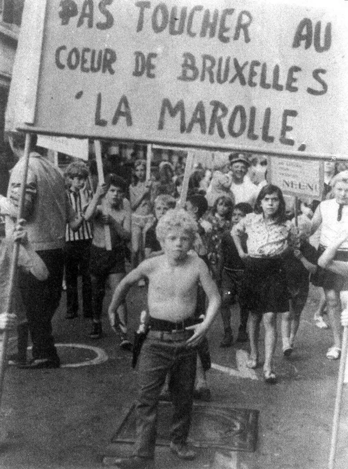 Illustration : La bataille de la Marolle, parfois aussi appelé bataille des Marolles, se déroule durant l'été 1969. Elle oppose les habitants de « La Marolle », la partie du quartier des Marolles qui se trouve sur la colline, au Ministère public qui les menace d’expropriation en vue d’un projet d’extension du palais de justice qui s’inscrit dans le cadre de la Bruxellisation. Après que les habitants aient reçu les lettres d’expropriation, un mouvement de contestation a débuté à l’initiative de Jacques Van der Biest, vicaire du quartier des Marolles. « La Bataille des Marolles » est un documentaire culte de 1969, réalisé par Pierre Manuel et Jean-Jacques Péché dans un style « cinéma-vérité » pour la RTBF. (©RTBF)