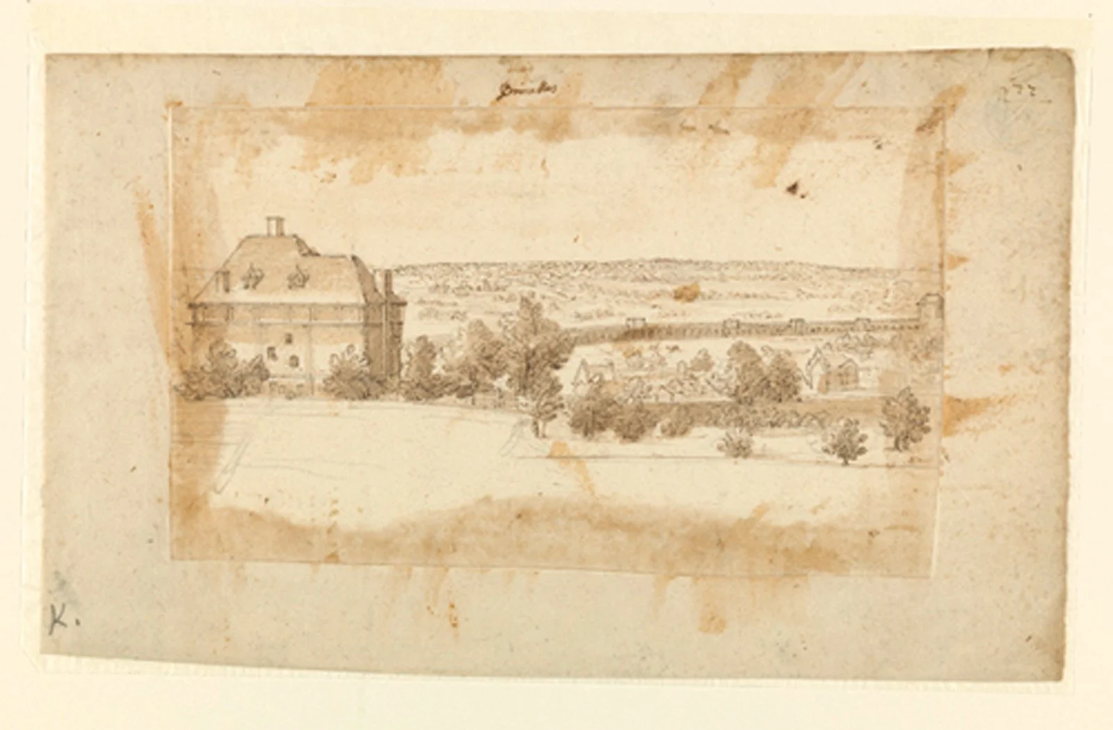 Illustration : Jardins de l'hôtel de Bournonville (1619) (futur Hôtel de Mérode) avec le pavillon de Beauregard par Remigio Cantagallina (1583-1636). À l'époque le batiment avait déjà son toit. (Musées Royaux des Beaux-Arts de Belgique)